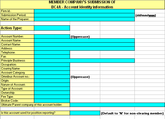 A unique "Account Number" must be assigned to each new account reported in Form BC4A. The account number may be up to 10 alphanumeric characters long. Only alphabets and numbers are acceptable. (Spaces, hyphens, underscores, asterisks, inverted commas, percent signs (%) and other characters will not be accepted). Please ensure that account numbers reported are in uppercase. Account numbers used must be the same as the account numbers used for trade matching and clearing in the SGXCLEAR system.