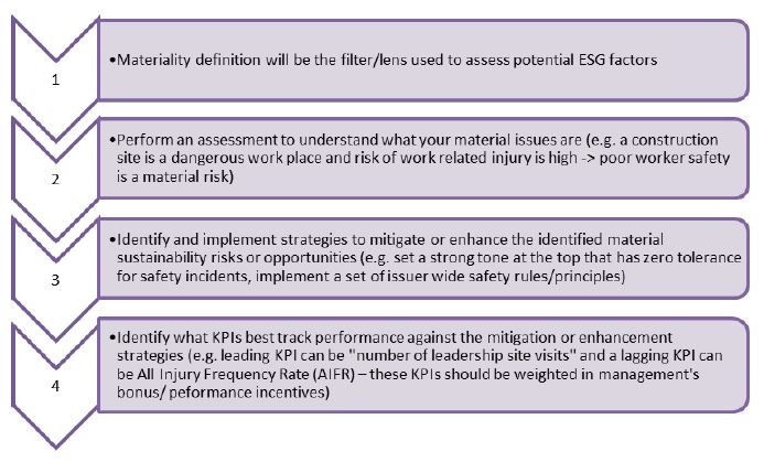 4.9 In assessing materiality of the ESG factors on which it reports, the issuer should first satisfy itself of the relevance of selected factors to its business strategy and outcomes. This has the benefit of focusing both executives and employees on uniform key risks and opportunities that deliver (or impede) desired outcomes.