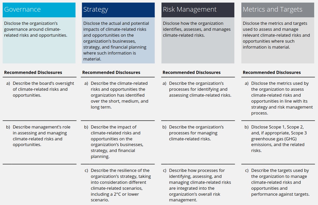 4.11 The TCFD developed recommended disclosures across four pillars: governance, strategy, risk management, and metrics and targets. The recommended disclosures provide an explanation on the requisite disclosures to fulfil the requirements of the four pillars.
